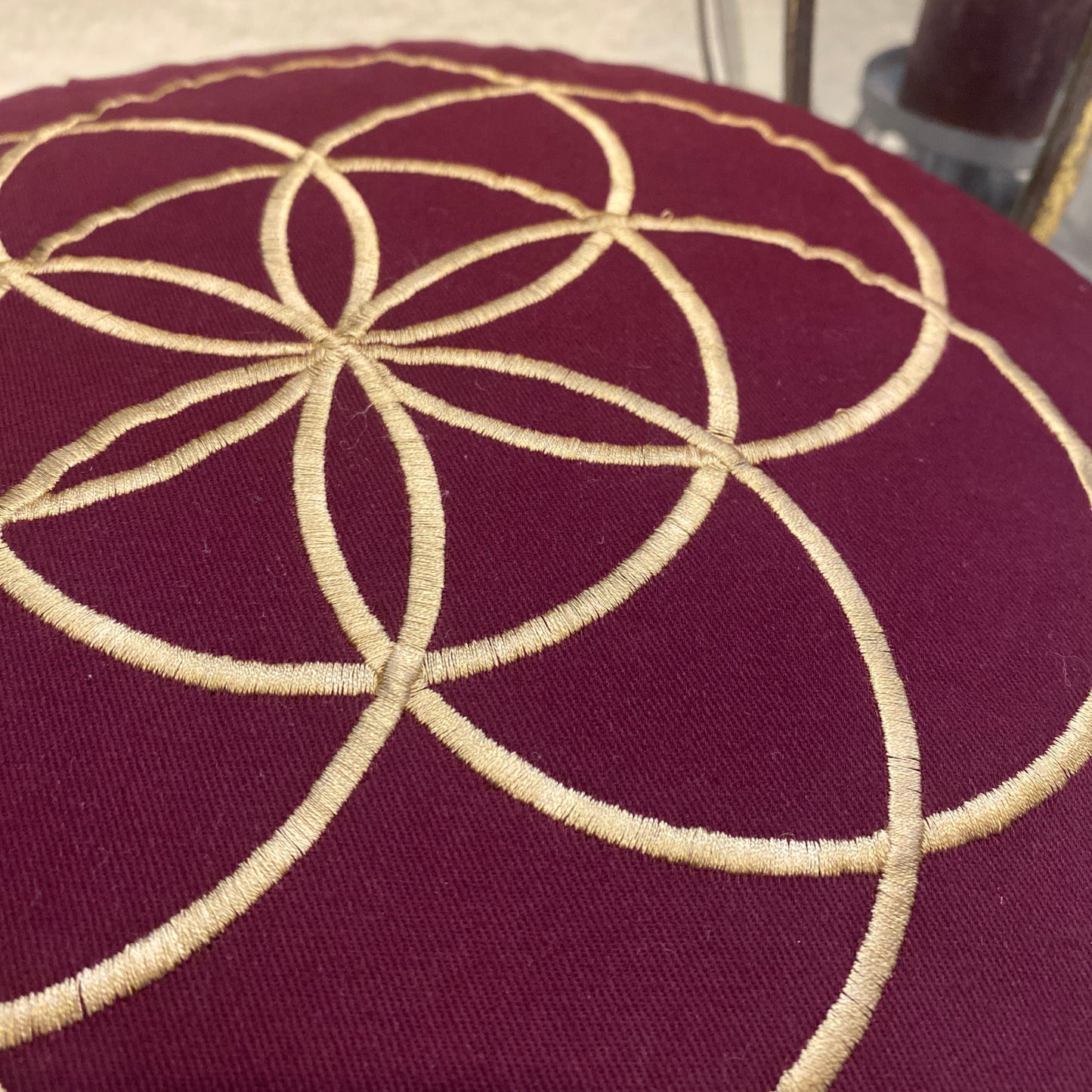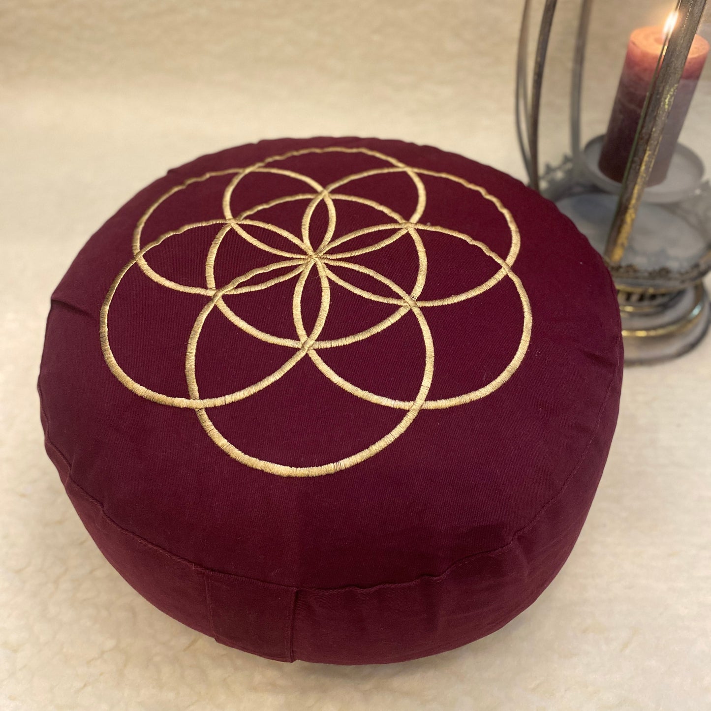 Die Blume des Lebens auf dem Bezug erinnert dich an das Wesentliche: Wir sind alle verbunden – auch mit dem inneren Frieden, den du gerade suchst. Und weil jede Praxis anders ist, kannst du die Höhe des Kissens ganz einfach anpassen: einfach ein bisschen Füllung raus oder rein, je nach Laune und Lotussitz.