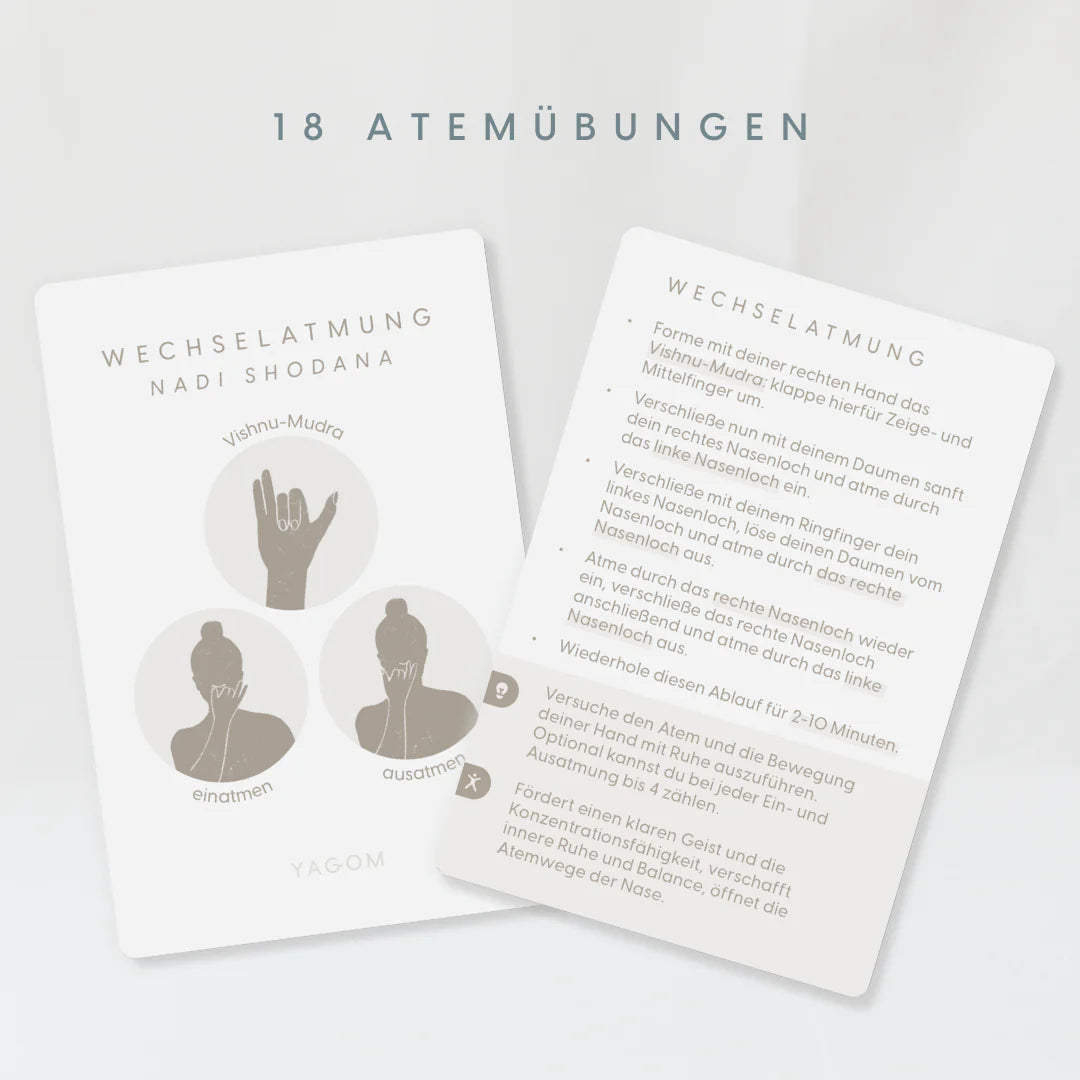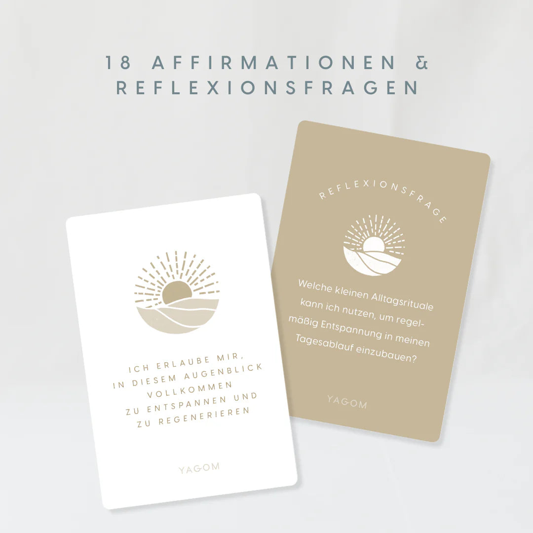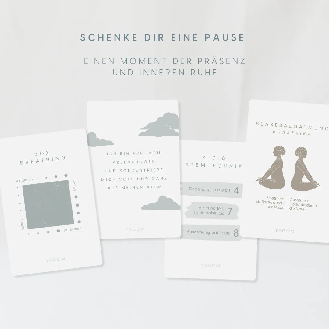 Dieses wundervolle Kartenset von Yagom setzt genau hier an: Atemtechniken, Affirmationen & Reflexionsfragen vereinen sich in 36 Karten. Für mehr Fokus, gezielte Entspannung und verbessertes Körperbewusstsein.