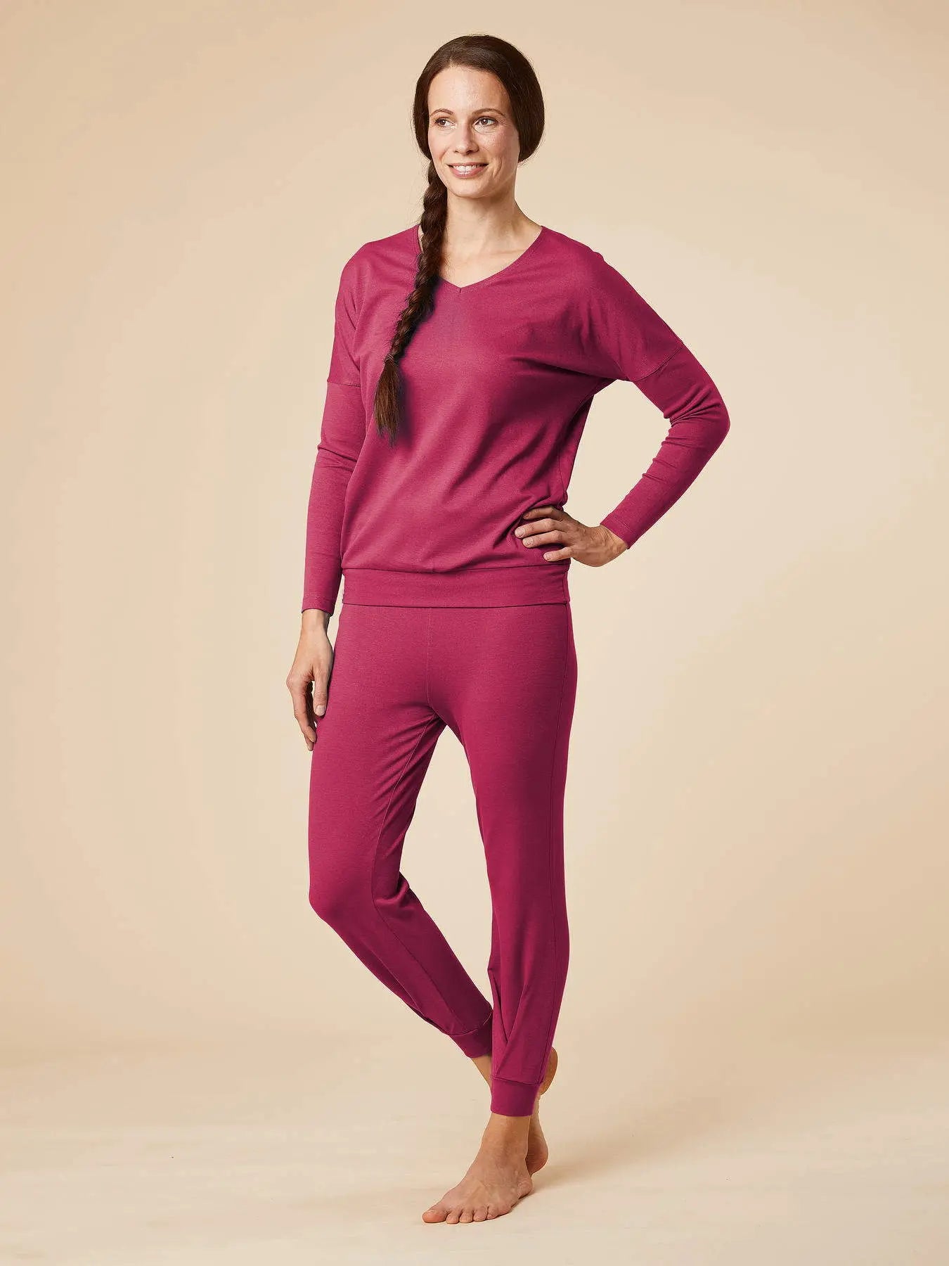 Unser Longsleeve Matangi in lässiger Fledermaus-Form: Perfekt zu verschiedenen Hosen und Leggins, auf der Matte oder danach. Durch das Bündchen bleibt auch während der Asanapraxis alles an Ort und Stelle. Und du kannst dein Oberteil mit den Bädchen sogar an der Hose festknoten, z.B. an der passende Shakti Leggings, oder der Homewear Hose Tara.