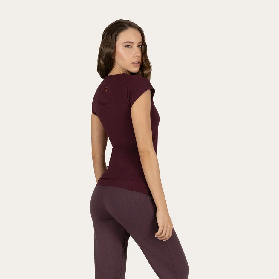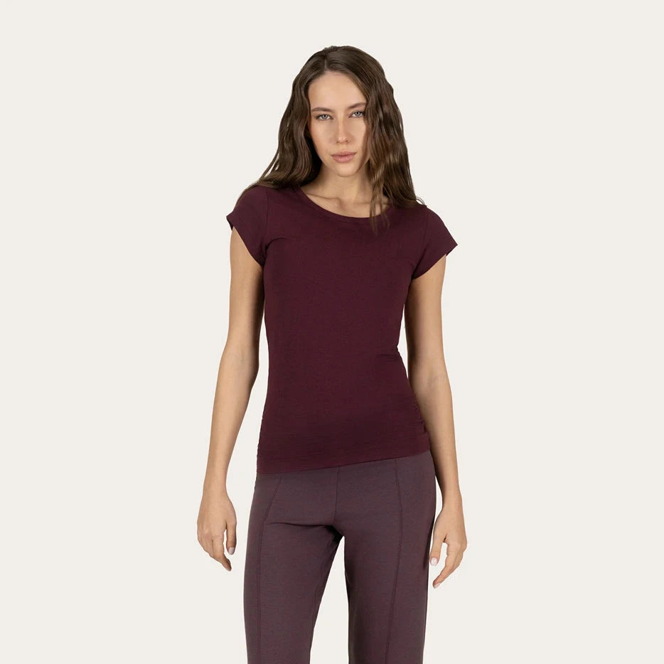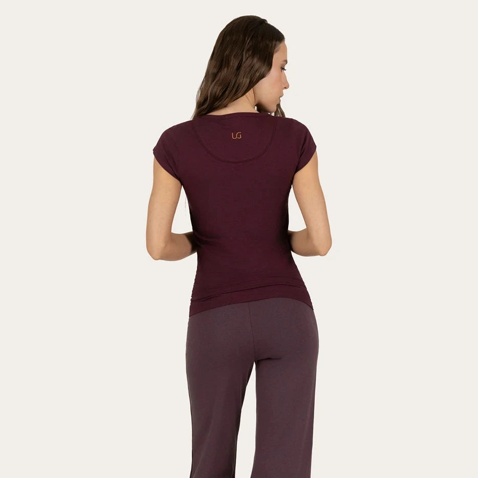 Aus Bio-Baumwolle und Lycra gefertigt, bietet dieses Damen-Yoga-Shirt eine sanfte Dehnbarkeit, die sich deinen Bewegungen anpasst, ohne einzuengen. Die Slim-Fit-Passform mit seitlichen Falten schmeichelt deiner Figur und sorgt während Yoga, Pilates oder Loungewear für optimalen Halt. Der weiche, hautfreundliche Stoff macht es zum perfekten Begleiter für jeden Moment – ob auf der Matte oder im Alltag.