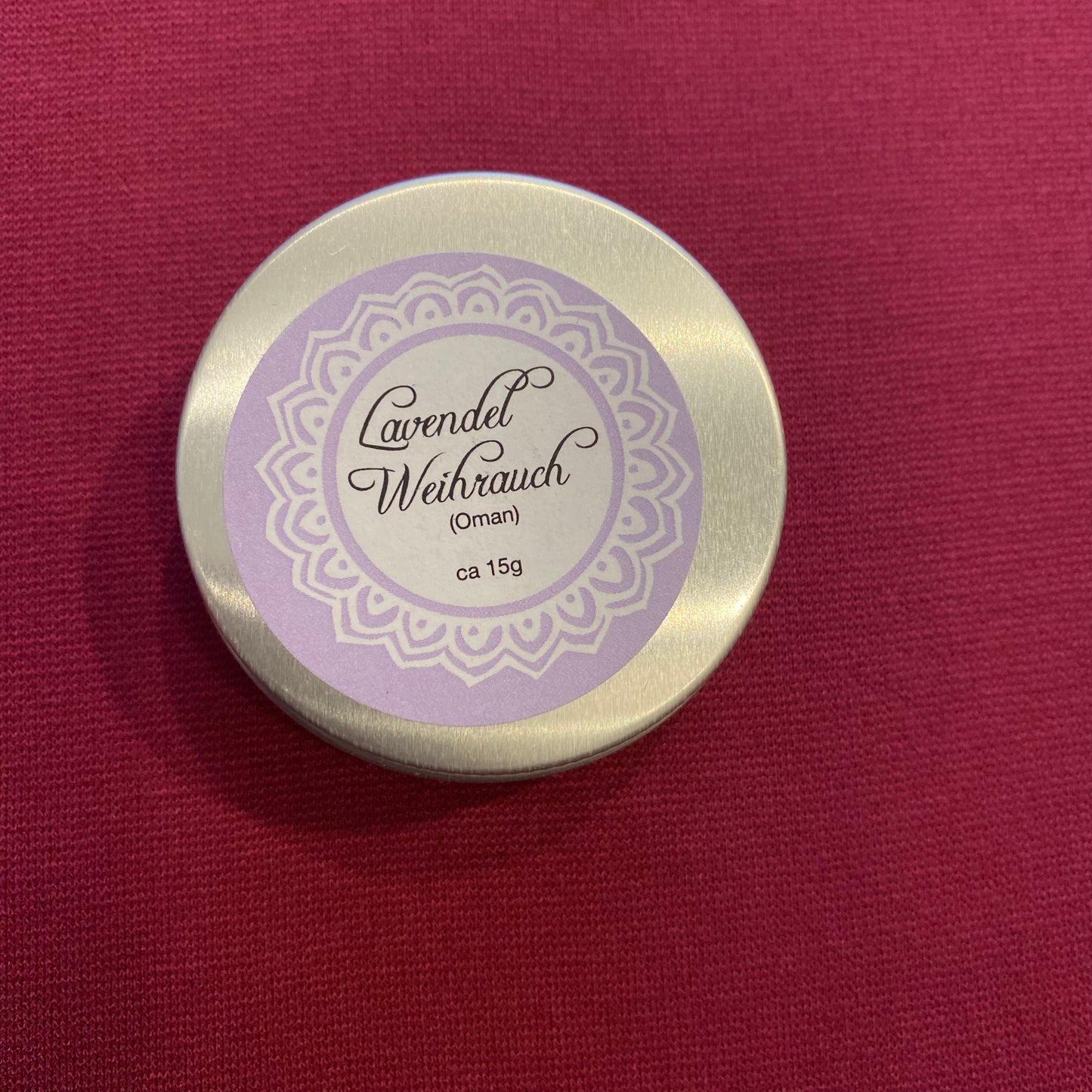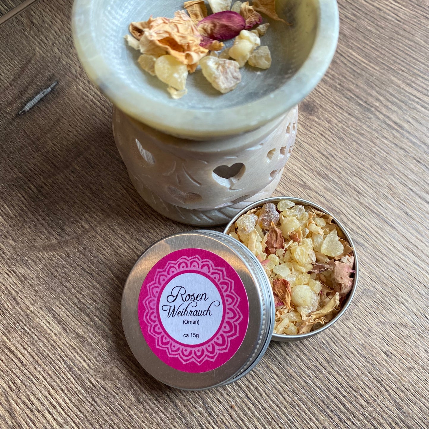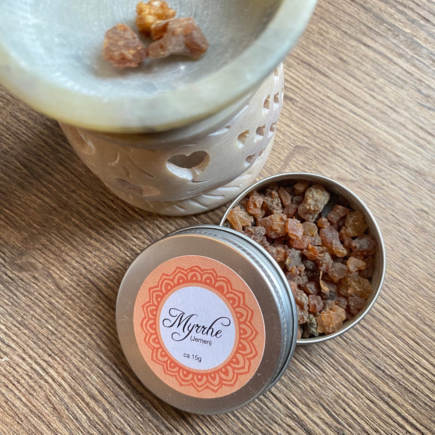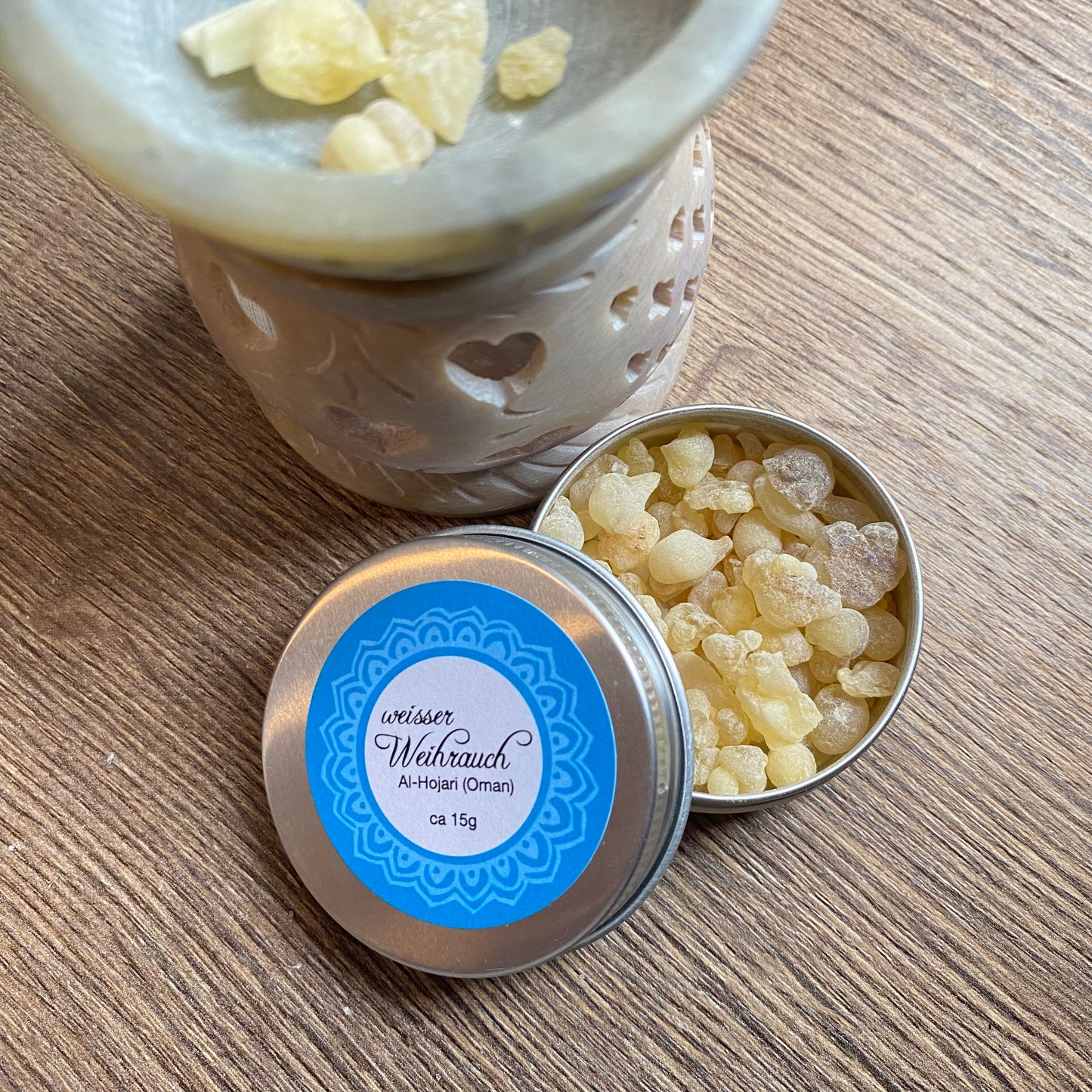Nach ein paar Minuten „schmurgelt“ der Weihrauch weg und wird braun, dann beginnt er bitter zu riechen, nun das Teelicht ausmachen oder den Weihrauch von der Kohle nehmen.
