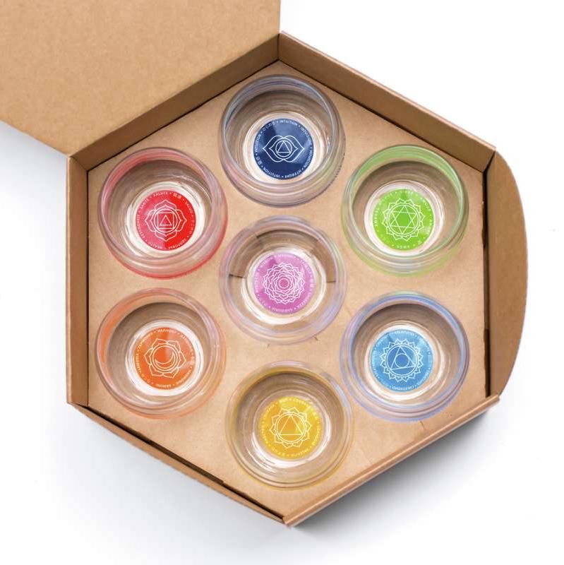 Ein farbiger Untergrund und das passende Symbol zeigen dir genau, zu welchem Chakra jedes einzelne Glas passt. Und das Beste - Jedes Glas hat auch noch seine Bedeutung auf dem Boden stehen. Von oben Lesbar, so das dir nichts daneben gehen kann, wenn du wissen willst, welches du gerade und er Hand hast, es sei denn, du trinkst lieber Saft statt Wasser.