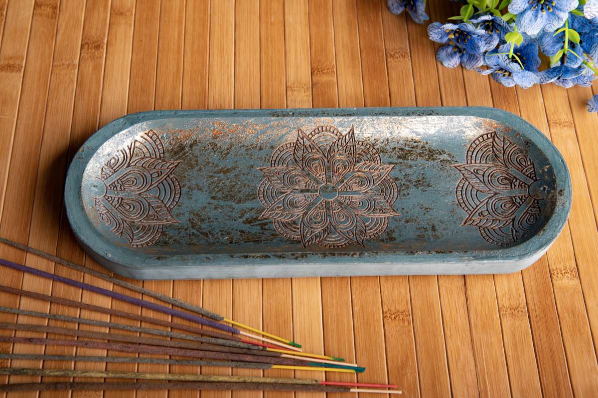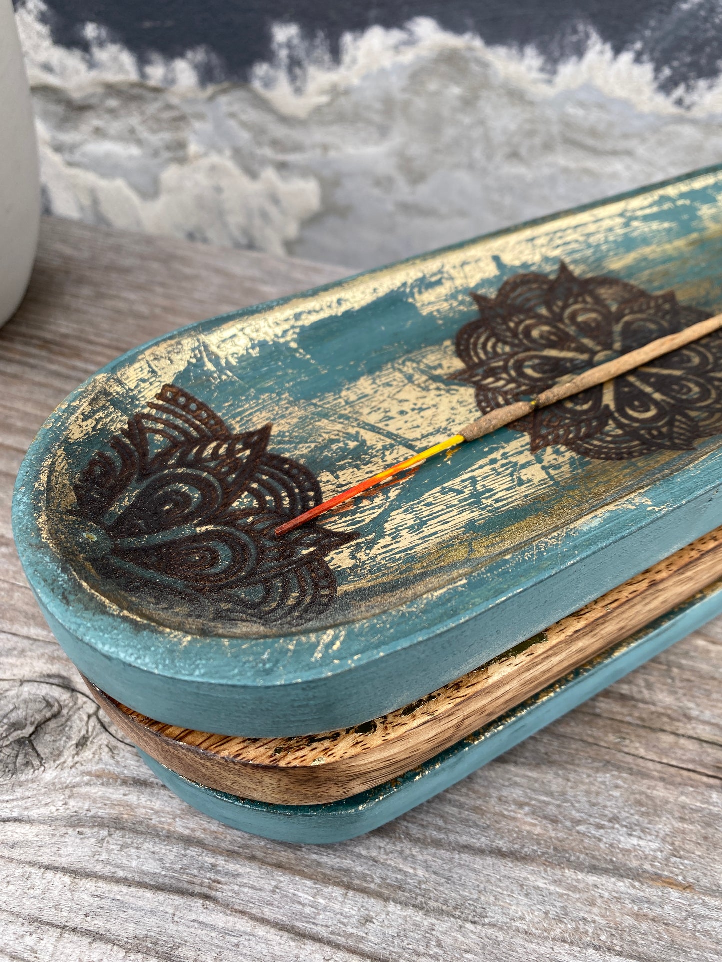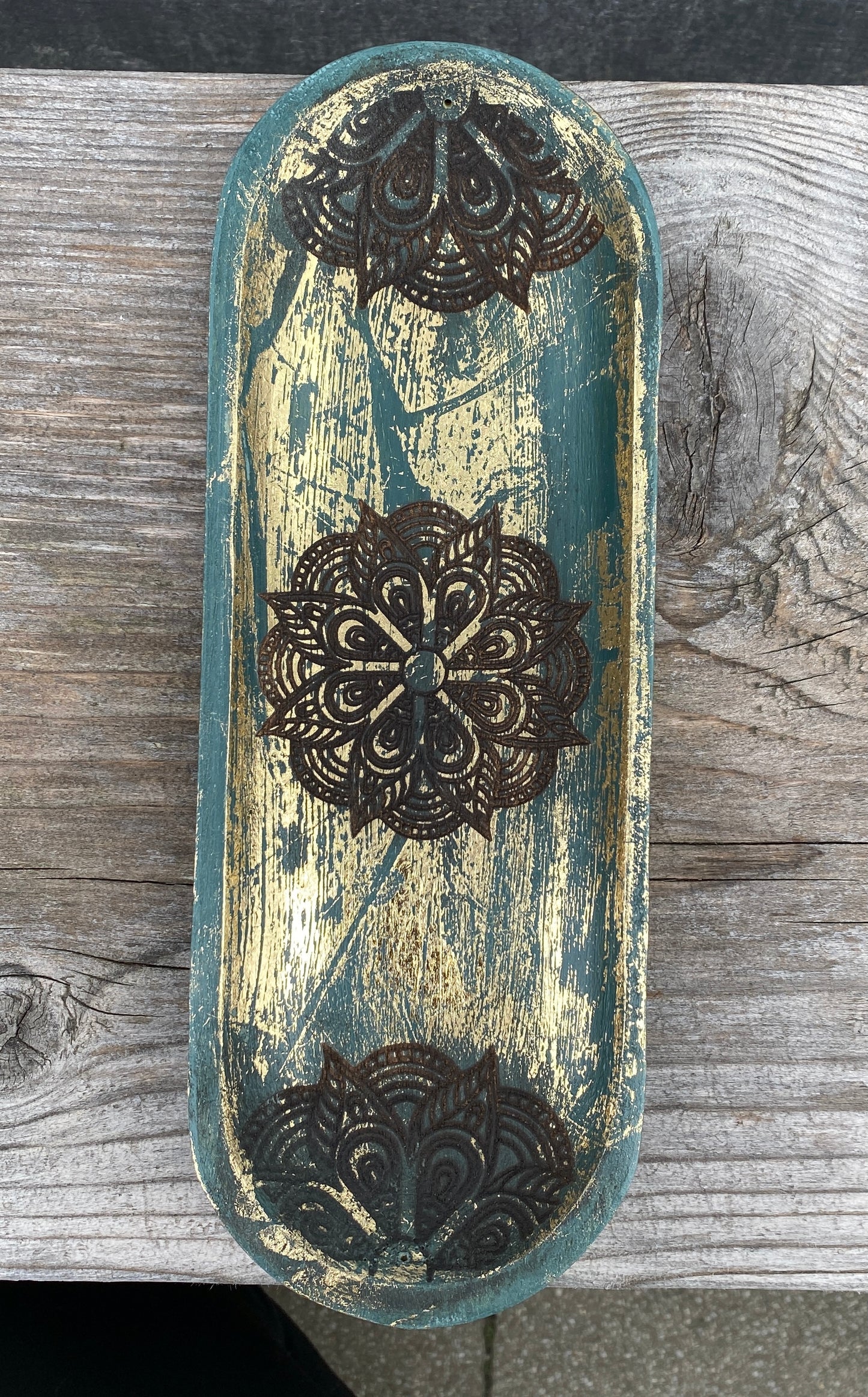 Oh, wie ist das schön: Der Räucherstäbchenhalter aus Holz, vergoldet und mittig platzierten Mandala. Die Stäbchen kannst du beidseitig befestigen und somit auch zwei zeitgleich anzünden. Der Halter ist prima für lange Räucherstäbchen geeignet und fängt so gut wie jede Asche auf.