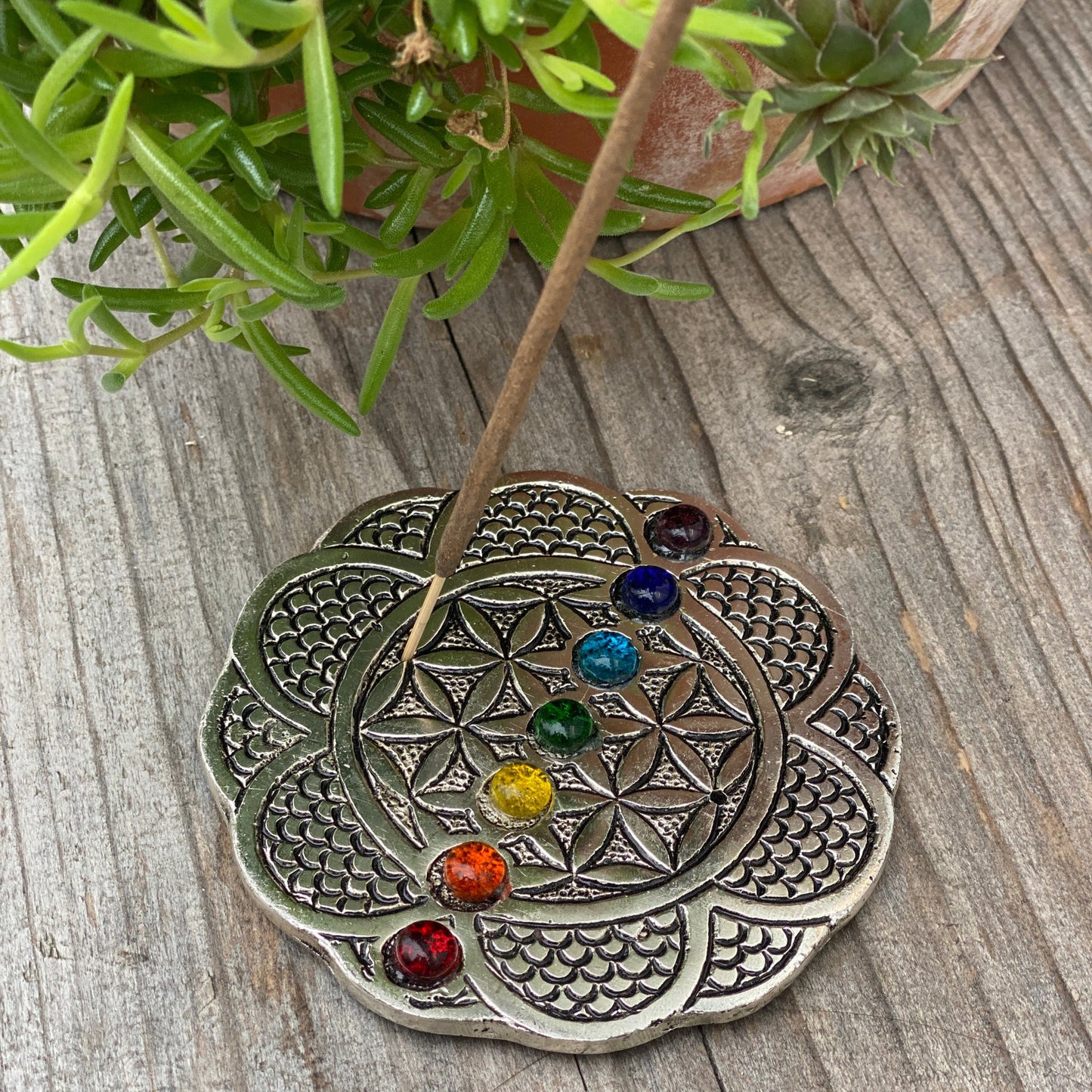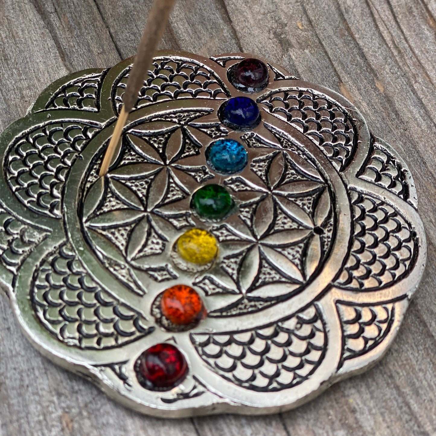 Lass deine Räucherstäbchen mit schmalem Holz auf der Blume des Lebens stehen. Dieser metallische, mit allen Chakra Farben aus Galssteinen bringt die positive Stimmung und Energie der Blume des Lebens gleich mit.