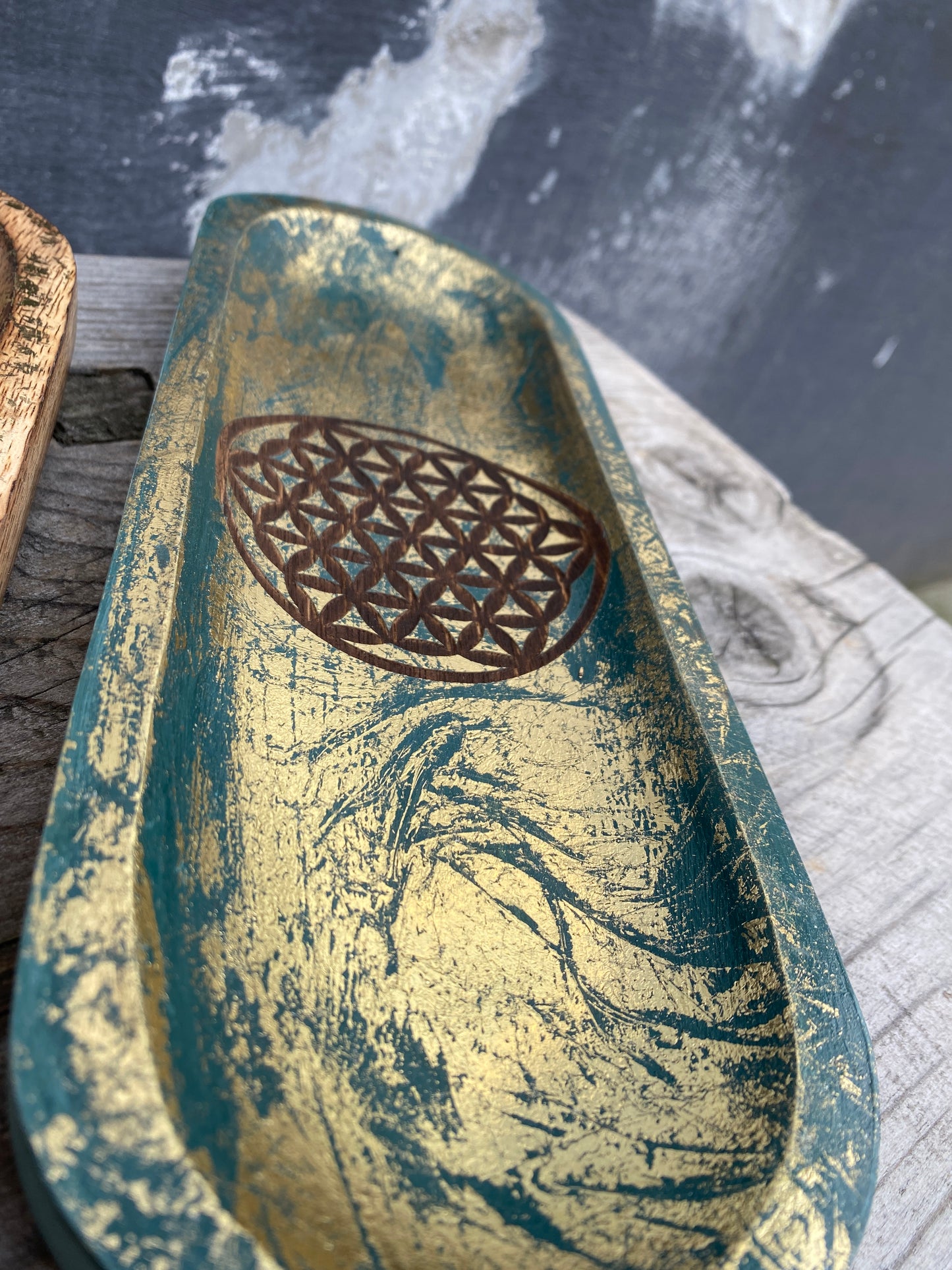 Oh, wie ist das schön: Der Räucherstäbchenhalter aus Holz, vergoldet und mittig platzierter Blume des Lebens. Die Stäbchen kannst du beidseitig befestigen und somit auch zwei zeitgleich anzünden. Der Halter ist prima für lange Räucherstäbchen geeignet und fängt so gut wie jede Asche auf. Die Löcher für die Halterung der Stäbchen sind unscheinbar, wodurch du das schicke Holz einfach umfunktionieren kannst: vielleicht als schönes Tablett oder Wandbehang?