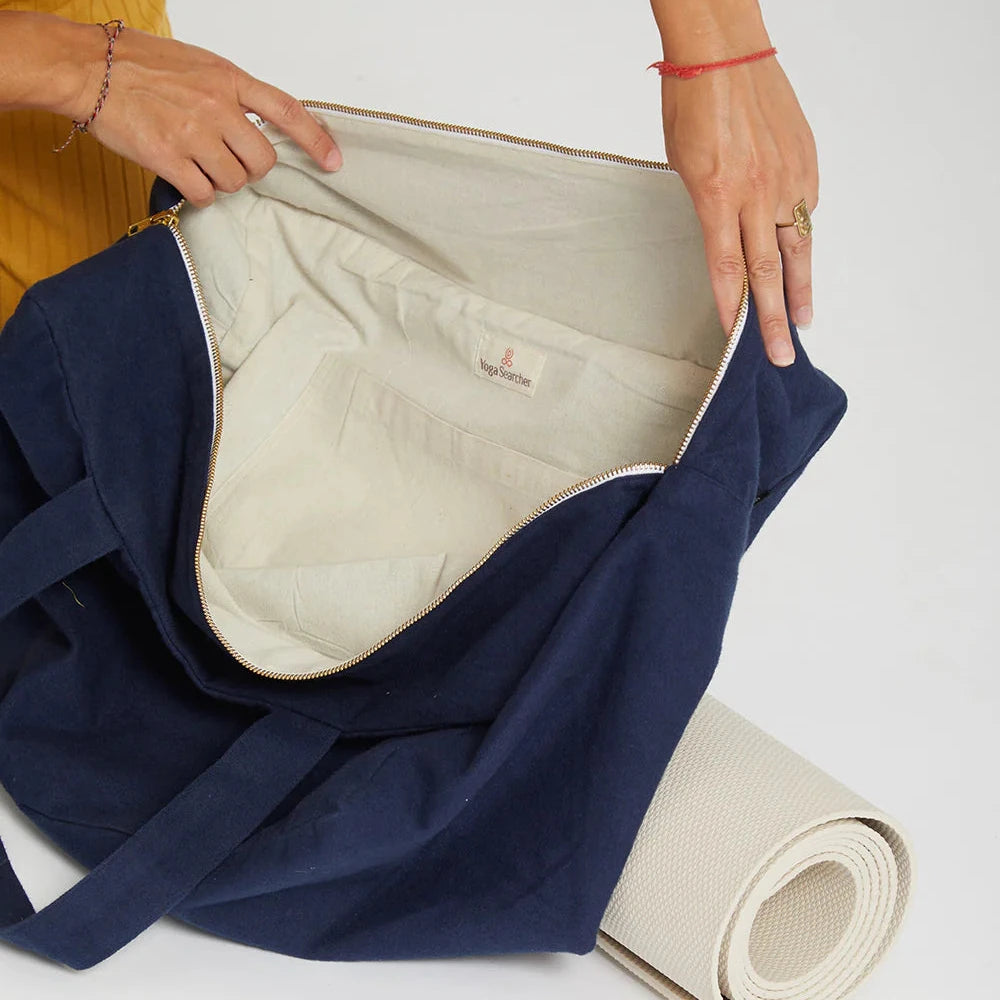 In diese Tasche passt deine gesamte Ausrüstung um beim Yogakurs mit allem ausgestattet zu sein. Kleidung, Block und sogar eine Decke kannst du verstauen. Und mit der speziellen Schlaufe nimmst du deine Yogamatte auf der Vorderseite einfach mit. Diese Tasche praktisch und stilvoll zugleich. Mit einem kleinen, dezenten Logo auf der Vorderseite erinnerst du dich immer an die wichtigste Haltung im Yoga: