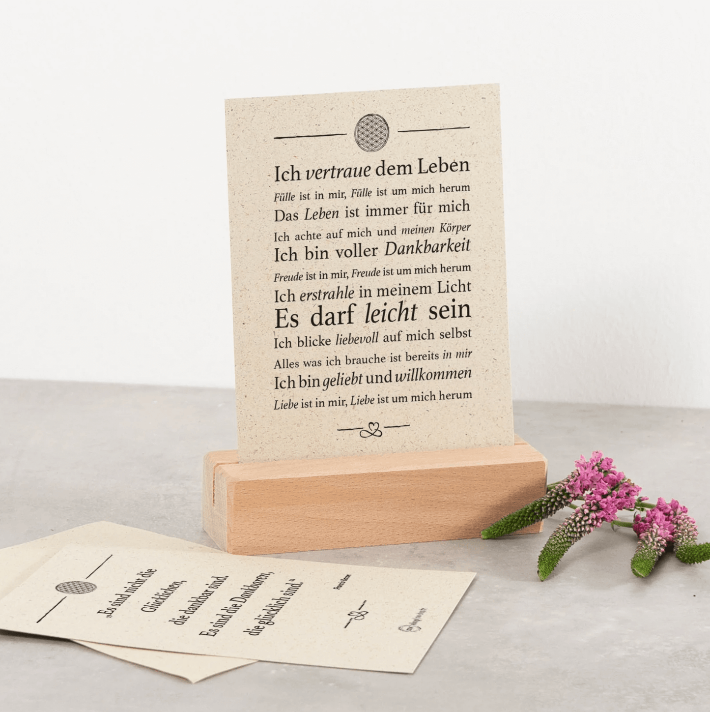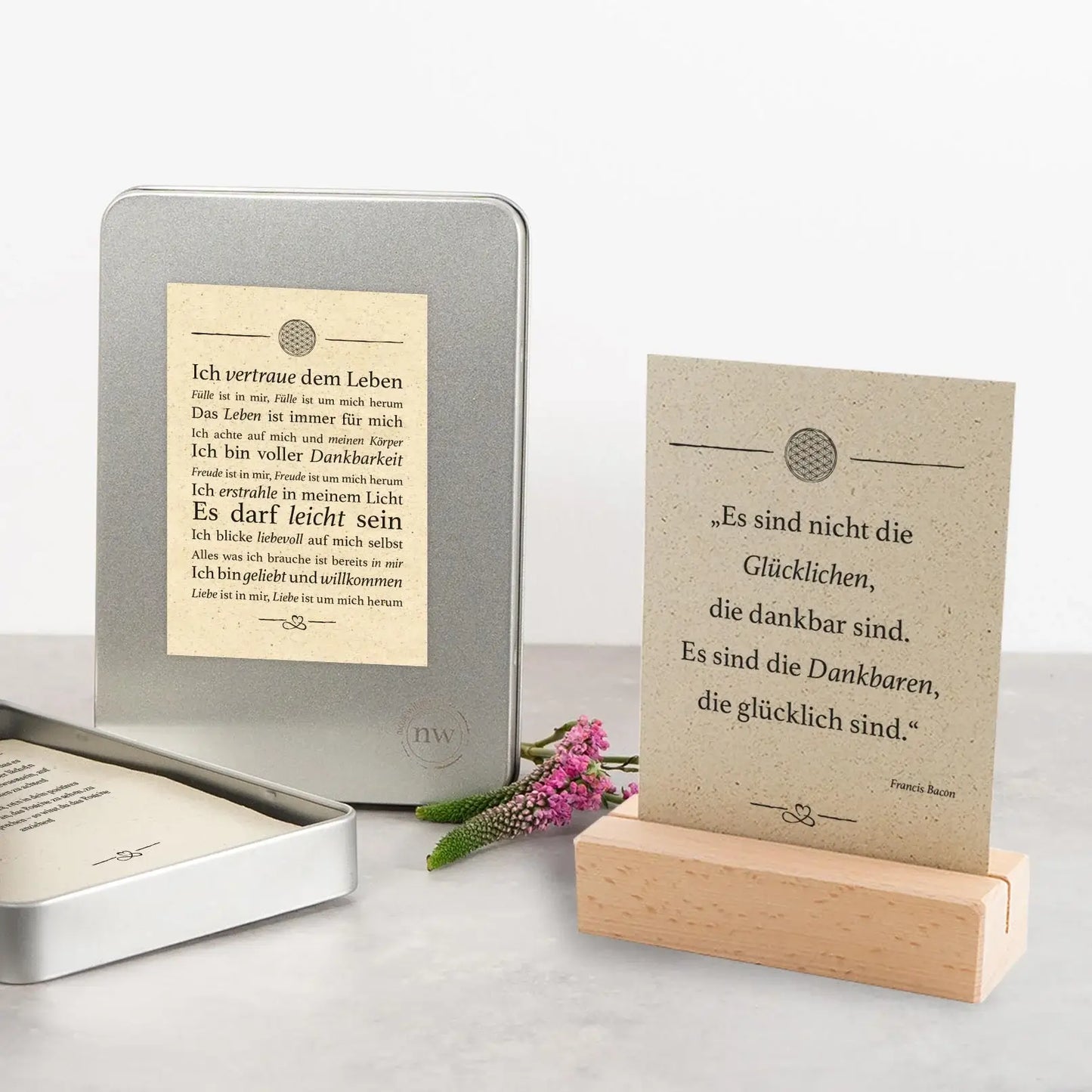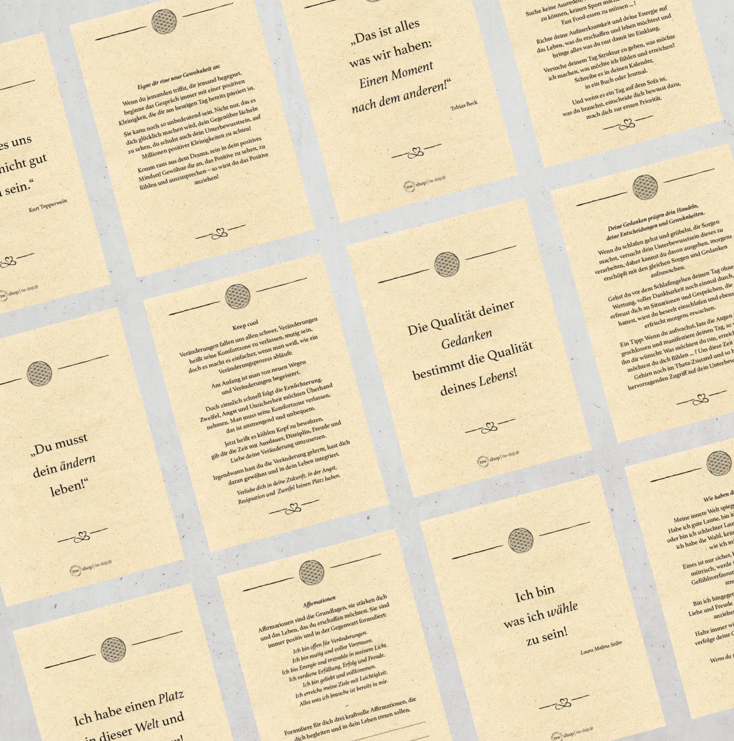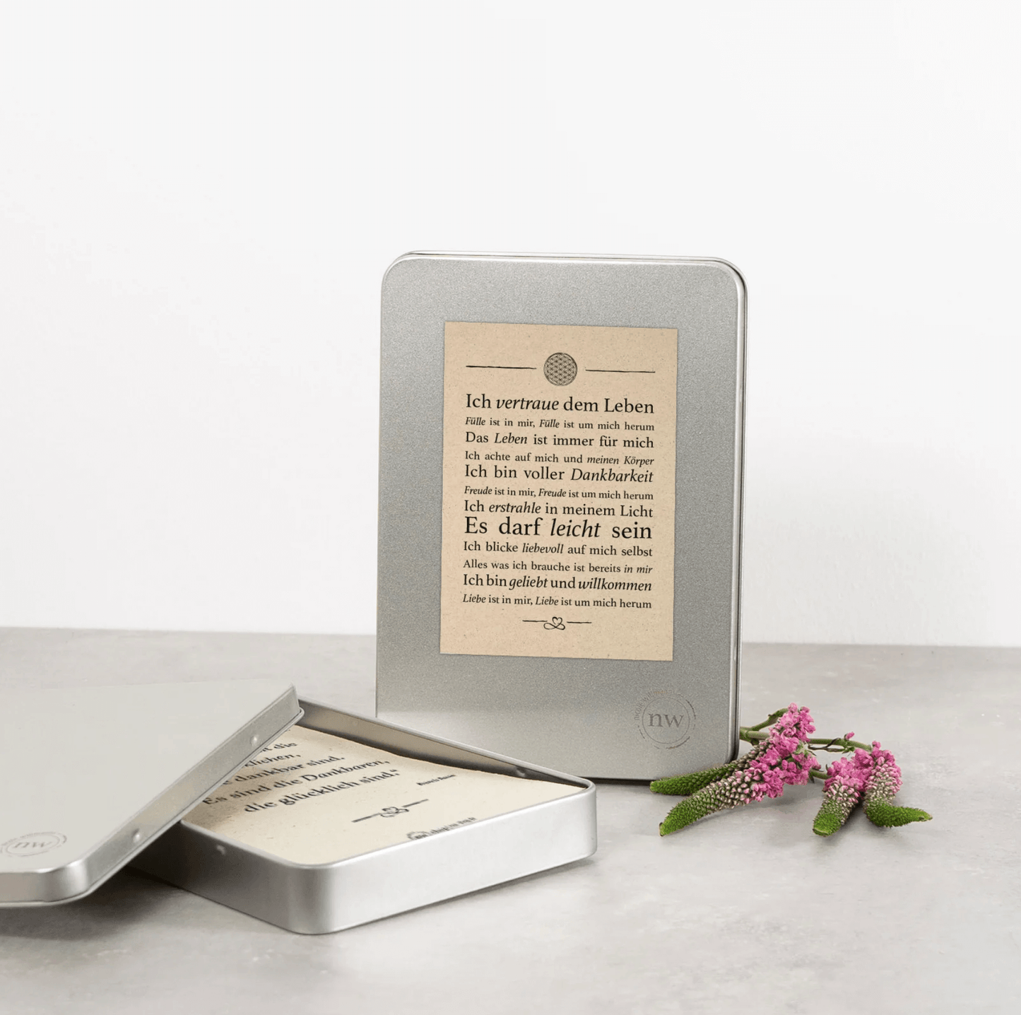 Dein Mindset - es ist erstaunlich, was sich da so alles verfestigt: Gedanken- und Verhaltensmuster die deinen Alltag manchmal unnötig erschweren. Eine kleine Erinnerung, gewisse Dinge auf eine neue, achtsamerweise zu betrachten bietet dieses wunderbare Kartenset aus Hamburg. Insgesamt finden sich 20 Mindset Karten, die auf ihrer Titelseite ein Zitat oder zum innehaltende Worte zeigen. Auf der Rückseite findest Du eine kleiner Erklärung, aber auch Übungen zu dem Thema der Karte. Für deine innere Haltung, für deine Ruhe, deine Achtsamkeit und dein Bewusstsein, für Dich!